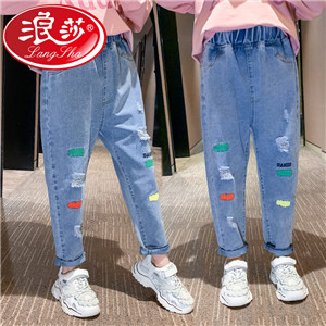 浪莎女童褲子春秋中大童洋氣寬松牛仔褲韓版女兒童裝春秋款休閑褲